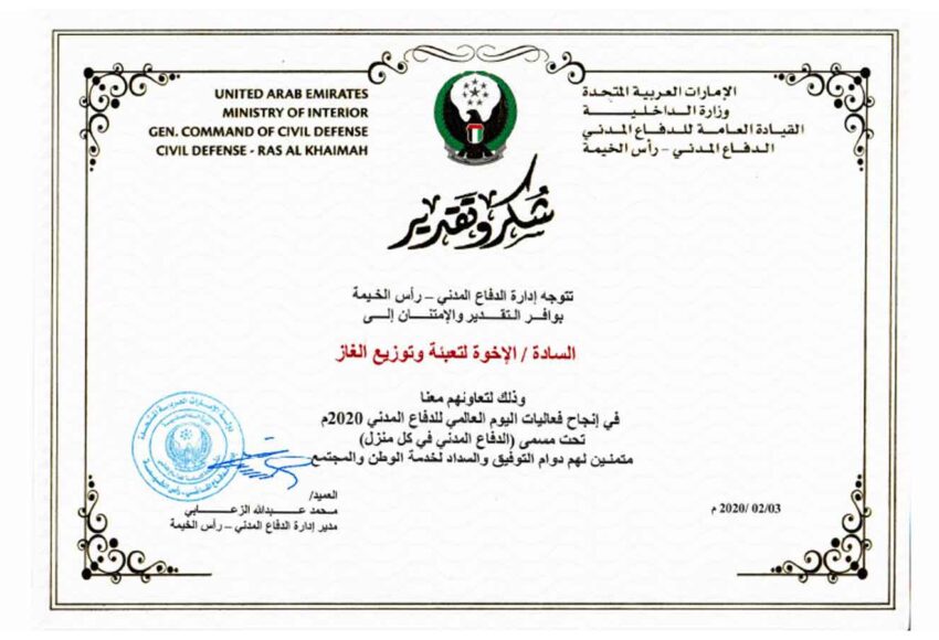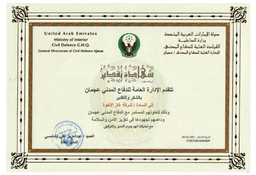 We are delighted to announce that BROTHERS GAS has received Appreciation Certificate from Ajman Civil Defense for the continuous support, cooperation and concern about the safety.